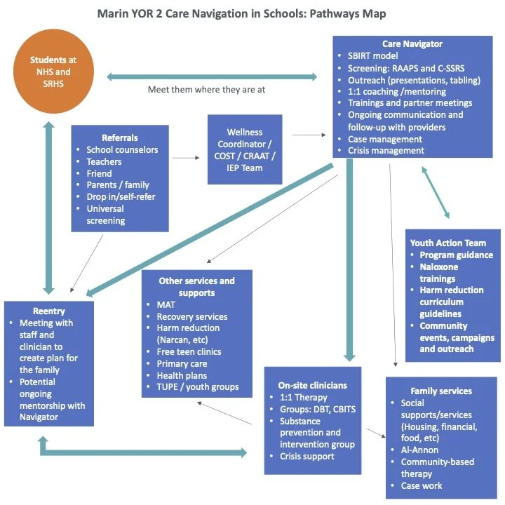 The Marin YOR Project is a collaboration between Marin County Probation, OD Free Marin, Marin 9 to 25, local CBOs and Marin County Schools to address Opioid Use Disorder (OUD) and Stimulant Use Disorder (StUD) in Marin County schools, through care navigation, clinical services, and harm reduction training and education.